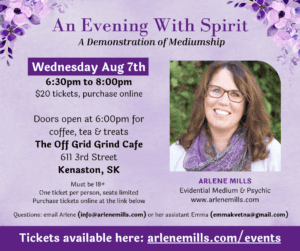 Join us in-person at The Off Grid Grind Cafe in Kenaston, Saskatchewan for an Evening of Mediumship with professional medium Arlene Mills. During the demonstration, Arlene will connect to audience members’ loved ones in spirit. Not everyone will receive a connection, but everyone will get to witness the beauty of mediumship. 18+ to attend. Arrive at 6pm to enjoy coffee, tea and treats! Doors close promptly at 6:30pm CST.